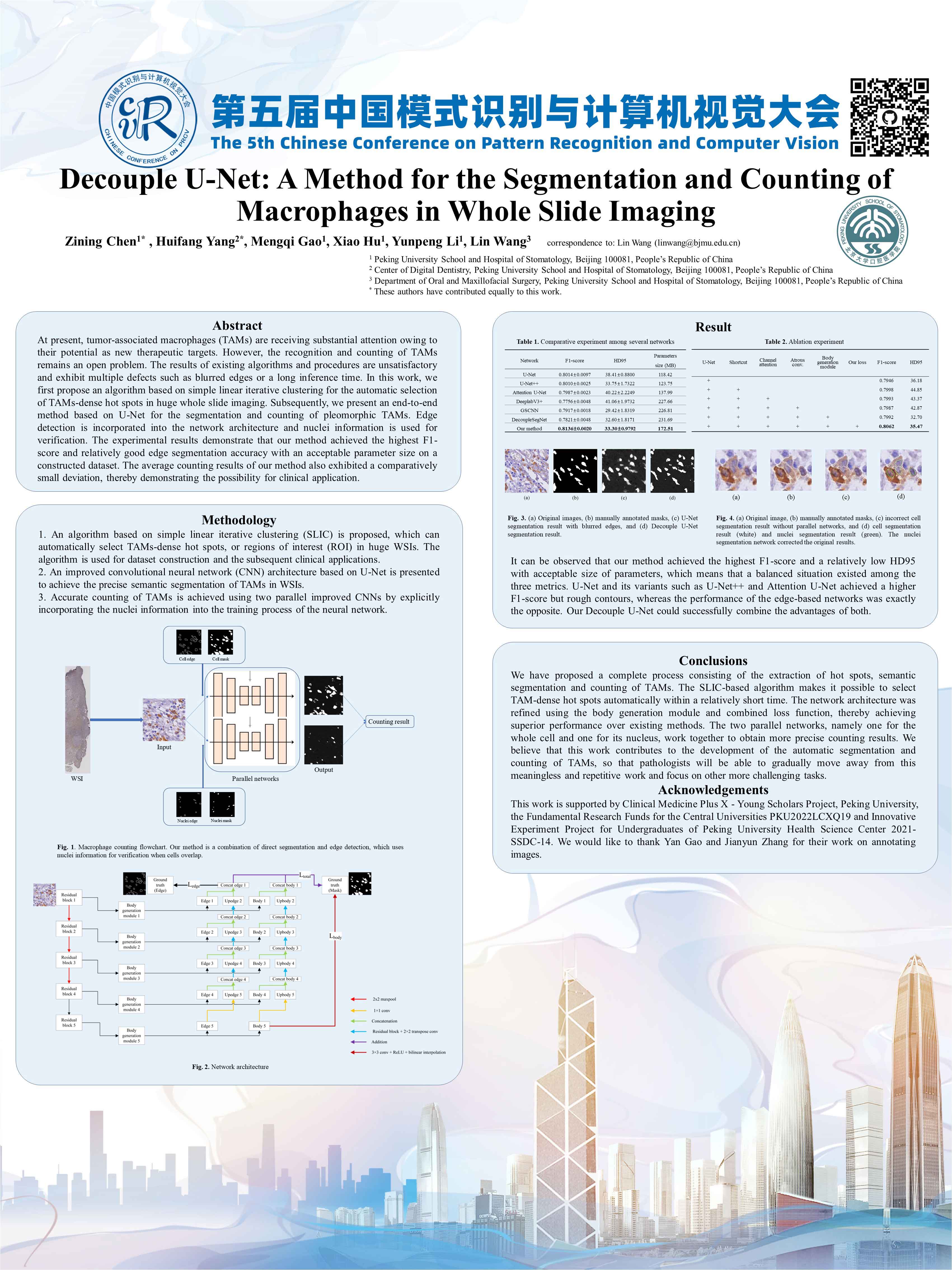 185 | Decouple U-Net: A Method for the Segmentation and Counting of Macrophages in Whole Slide Imaging | Chen, Zining*; Yang, Huifang; Gao, Mengqi; Hu, Xiao; Li, Yunpeng ; Wang, Lin |