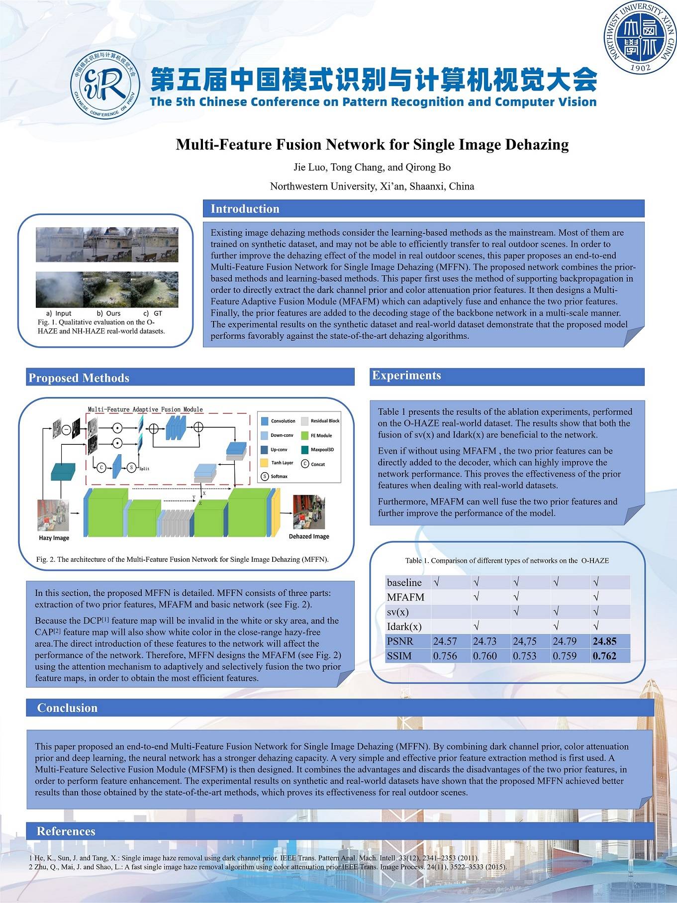316 | Multi-Feature Fusion Network for Single Image Dehazing | Chang, Tong; Bu, Qirong*; Luo, Jie |