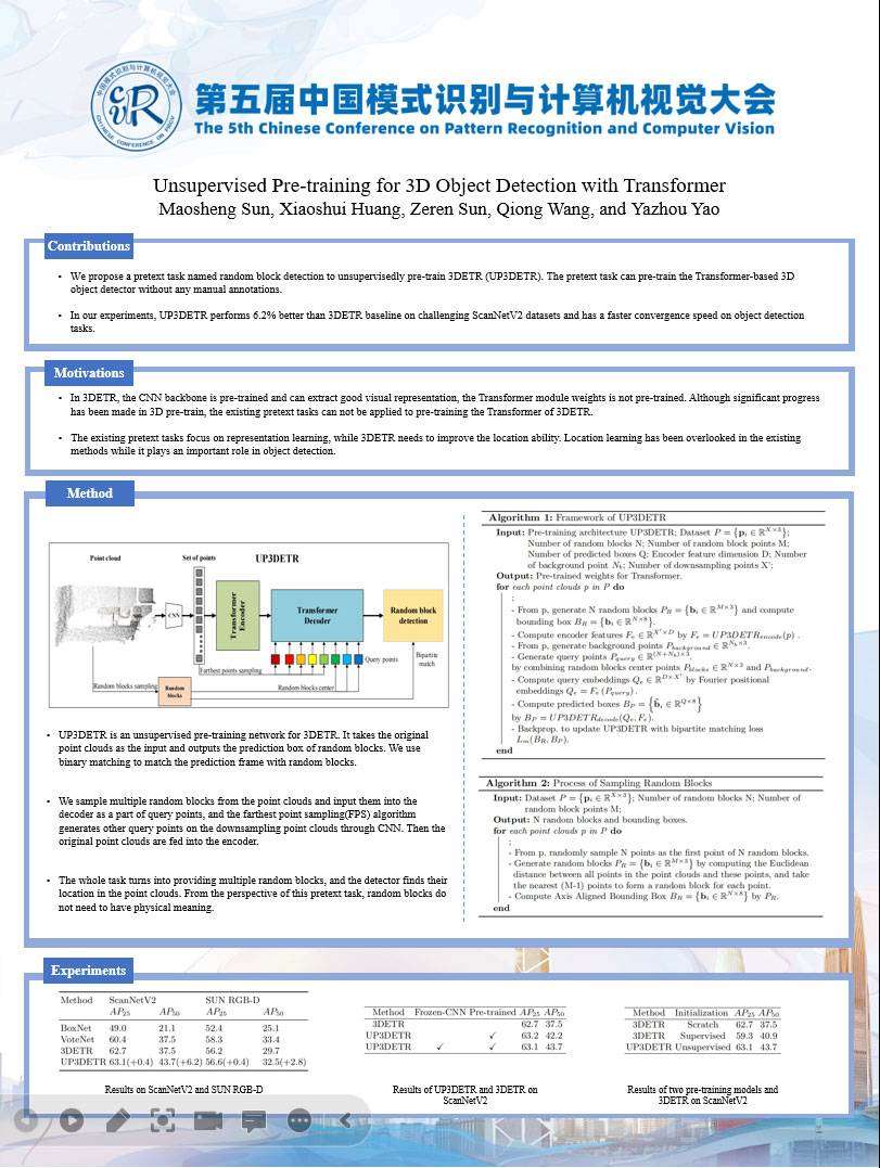 323 | Unsupervised Pre-training for 3D Object Detection with Transformer | Sun, Maosheng*; Huang, Xiaoshui; Sun, Zeren; Wang, Qiong; Yao, Yazhou |