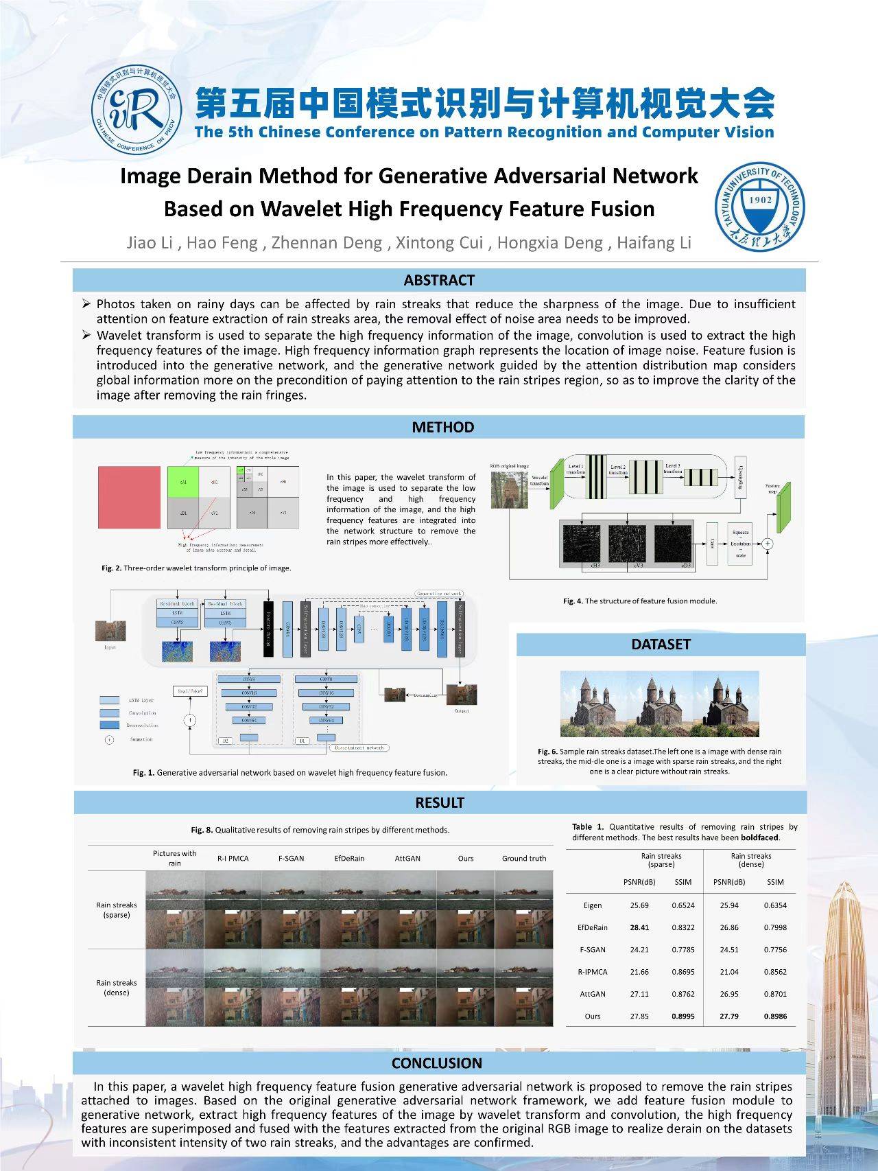 400 | Image derain method for generative adversarial network based on wavelet high frequency feature fusion | Li, Jiao*; Feng, Hao; Deng, Zhennan; Cui, Xintong; Deng, Hongxia; haifang, Li |