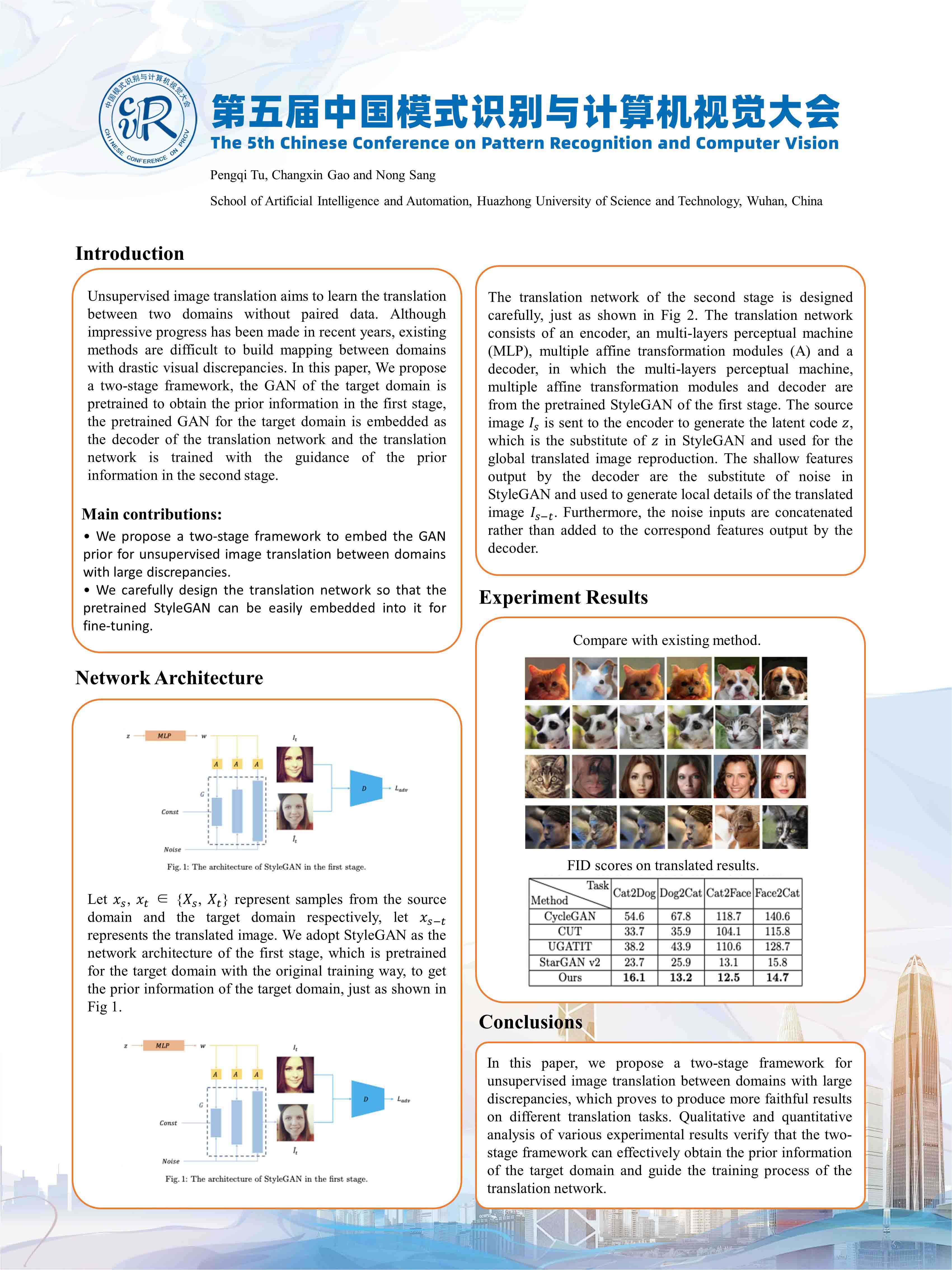 404 | Unsupervised Image Translation with GAN Prior | Tu, Pengqi; Gao, Changxin; Sang, Nong* |