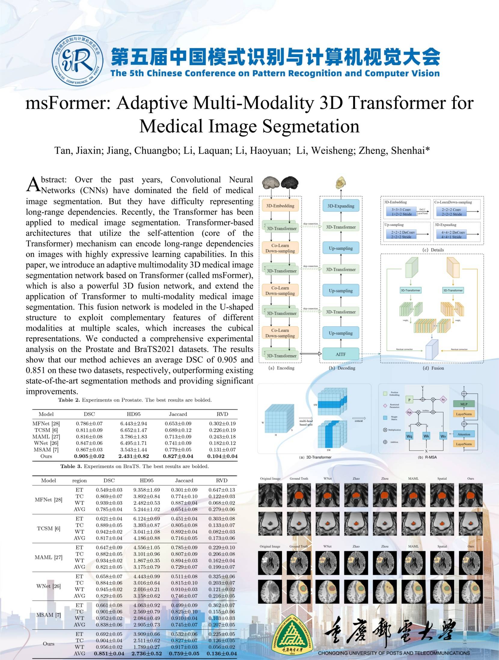 488 | msFormer: Adaptive Multi-Modality 3D Transformer for Medical Image Segmentation | Tan, Jiaxin; Jiang, Chuangbo; Li, Laquan; Li, Haoyuan; Li, Weisheng; Zheng, Shenhai* |