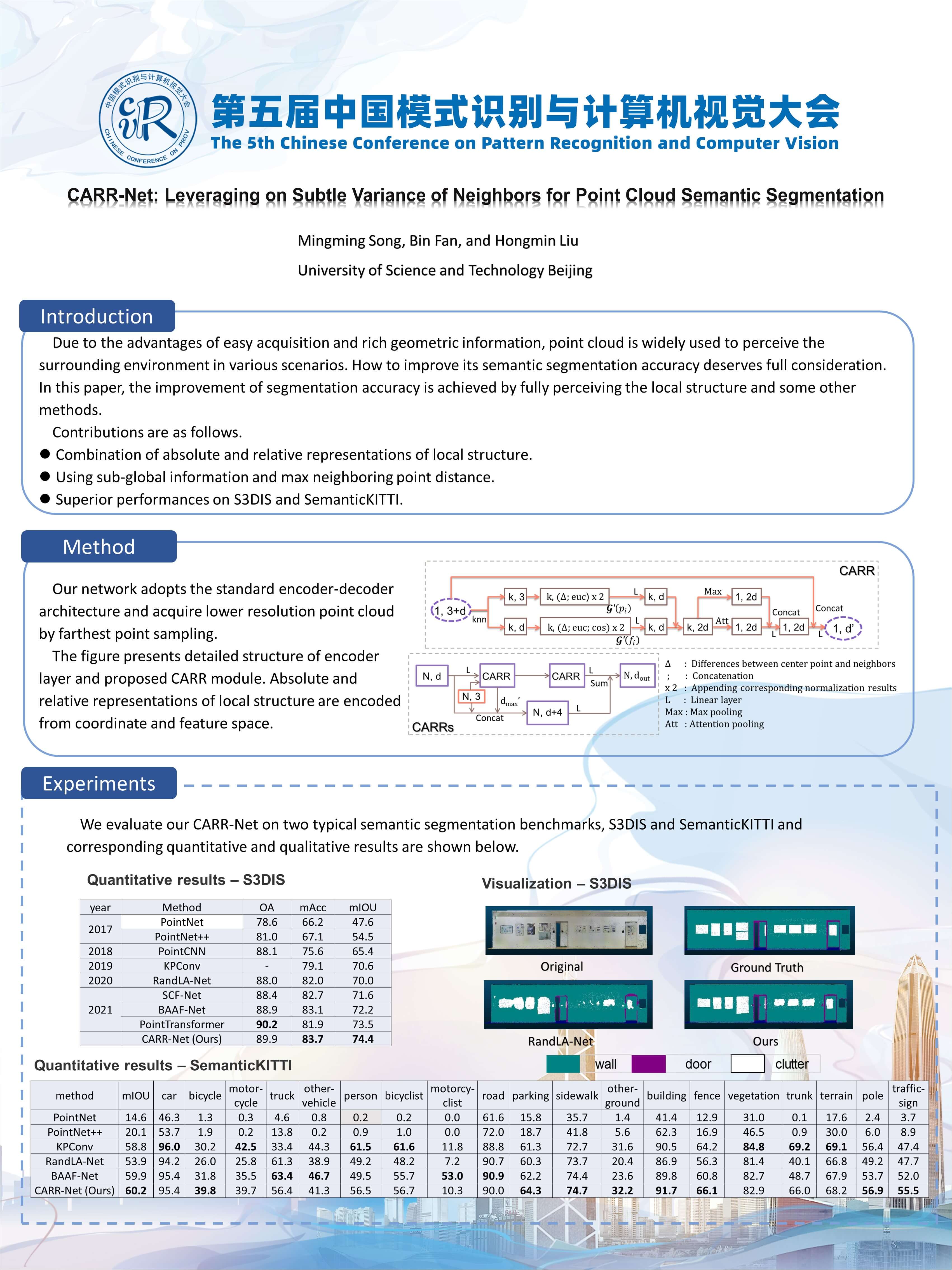 509 | CARR-Net: Leveraging on Subtle Variance of Neighbors for Point Cloud Semantic Segmentation | Song, Mingming*; Fan, Bin; Liu, Hongmin |