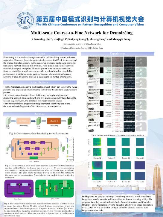526 | Multi-scale Coarse-to-fine Network for Demoiréing | Liu, Chenming; Li, Jinjing*; Gang, Ruipeng ; Feng, Shuang; Chang, Mengqi |