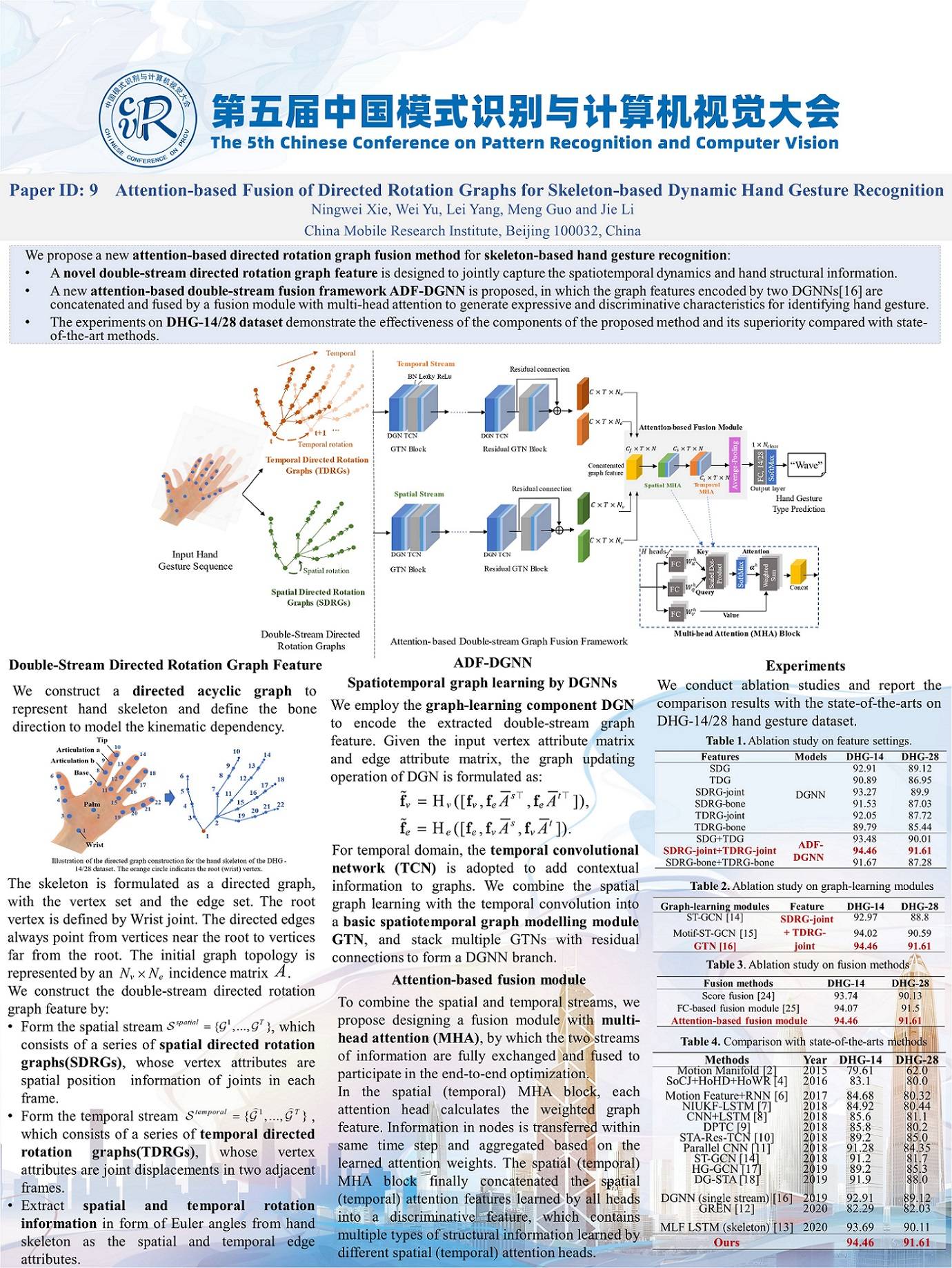 9 | Attention-based Fusion of Directed Rotation Graphs for Skeleton-based Dynamic Hand Gesture Recognition | Xie, Ningwei*; Yu, Wei; Yang, Lei; Guo, Meng; Li, Jie |